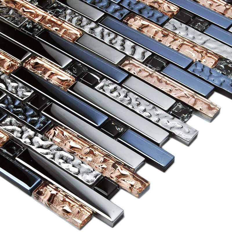 La mosaïque linéaire en verre est très populaire pour la décoration murale intérieure, en particulier pour les dosserets de cuisine, les murs de salle de bain, les murs de douche, les murs d'accent et les cheminées. Le carreau est composé à 100% de carreaux de verre, en verre à haute température. Les couleurs sont or rose, argent, bleu encre, noir. Parce qu'il y a un revêtement chromé sur la finition de ce carreau de verre. Il reflétera des choses comme des miroirs qui feront paraître l'espace plus grand.